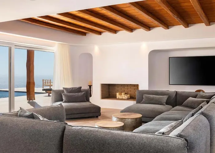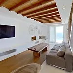 Το πλησιέστερο αεροδρόμιο είναι Κρατικός Μυκόνου και βρίσκεται σε απόσταση 10 χλμ. από βίλα. Η ηλιόλουστη βεράντα βλέπει στην πόλη. Αυτή η βίλα προσφέρει επίσης εξωτερική πισίνα.